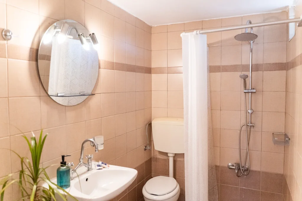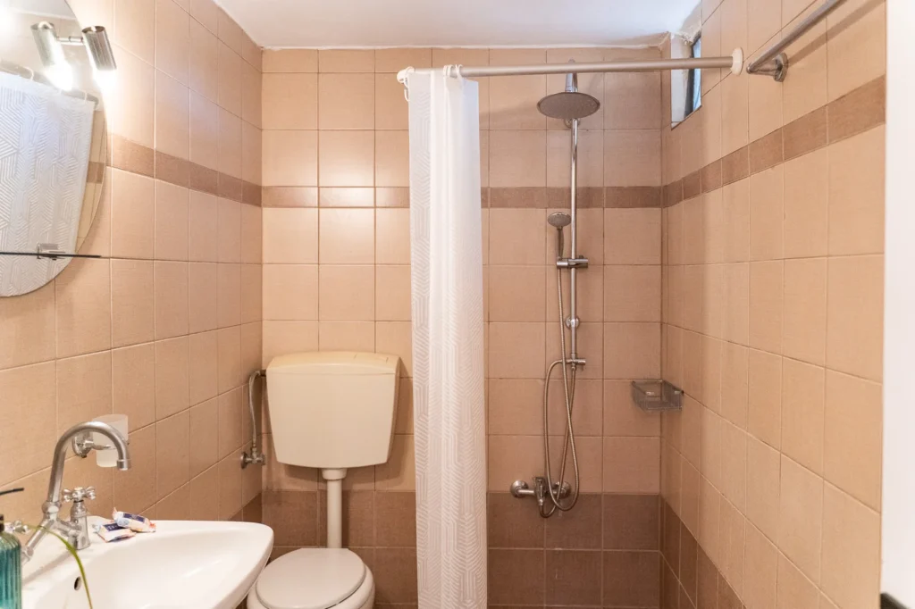 Our functional and clean bathroom is equipped with all the essentials for your personal hygiene. It features a spacious shower with a fixed and movable showerhead, a sink, a mirror, and toiletries to make you feel right at home.